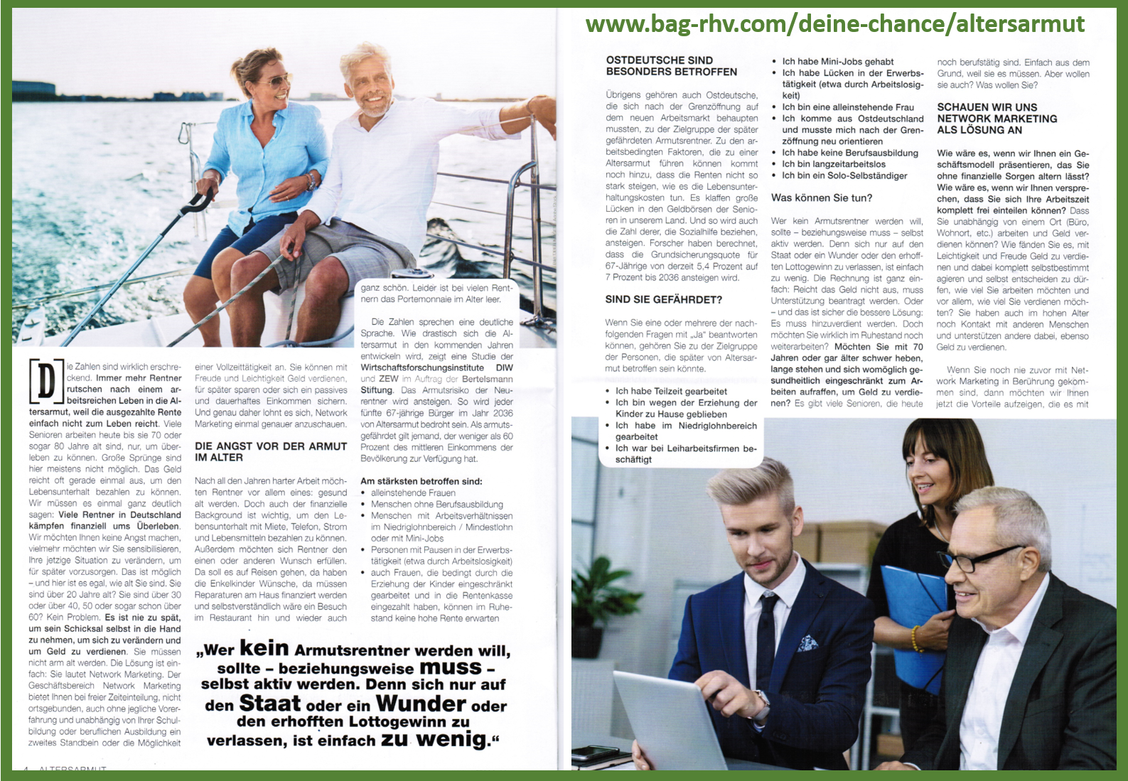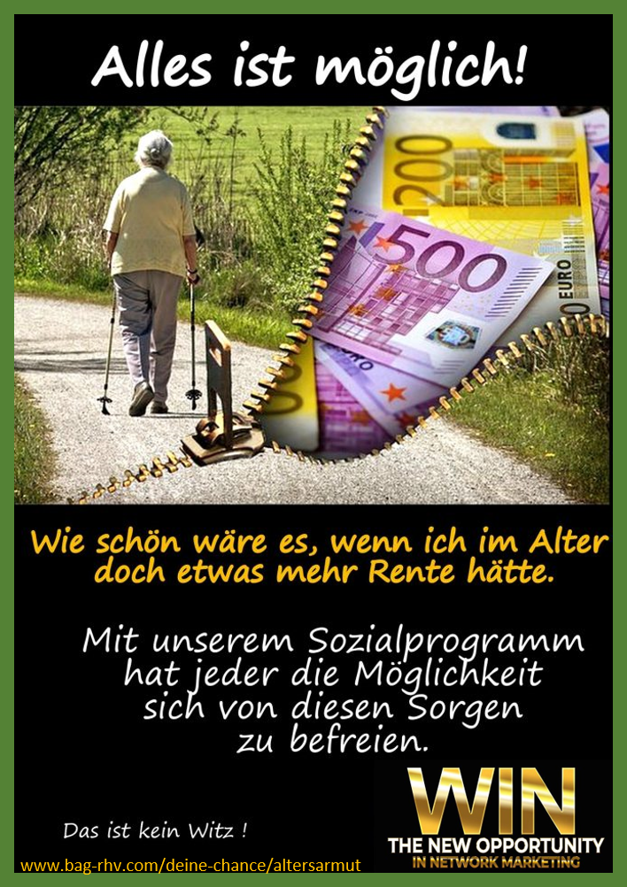 Täglich sehen und hören wir über Altersarmut traurige Berichte und Schlagzeilen, lass es bei Dir nicht soweit kommen, starte schon jetzt Deine finanzielle Unabhängigkeit, durch ein passives Einkommen, welches Du sogar vererben kannst.